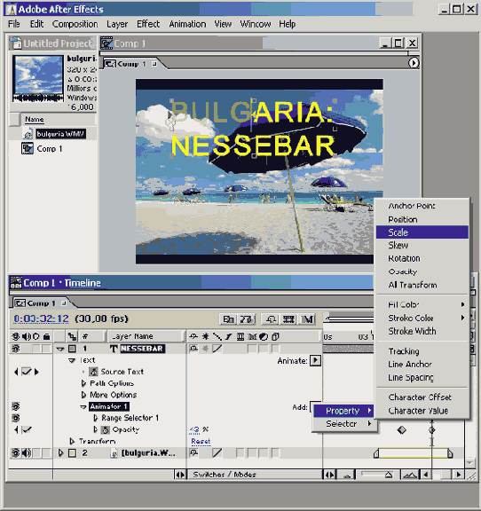 9. Для того чтобы настроить одновременную анимацию и другим фрагментам текста, создайте еще один аниматор при помощи того же всплывающего меню Animate (Анимация) и настройте размеры соответствующего селектора в окне Composition (Композиция), а также ключевые кадры в окне Timeline (Монтаж).
